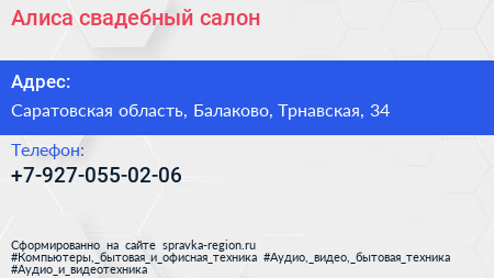 Алиса, свадебный салон по адресу Саратовская область, Балаково, Трнавская, 34 в дальнейшем Организация, размещена в следующих категориях: