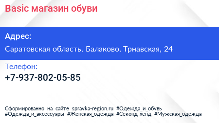 Basic, магазин обуви по адресу Саратовская область, Балаково, Трнавская, 24 в дальнейшем Организация, размещена в следующих категориях: