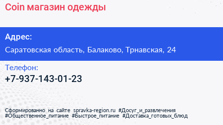 Coin, магазин одежды по адресу Саратовская область, Балаково, Трнавская, 24 в дальнейшем Организация, размещена в следующих категориях: