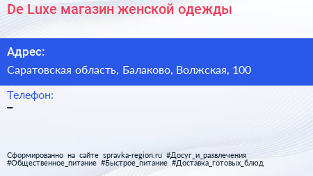 De Luxe, магазин женской одежды по адресу Саратовская область, Балаково, Волжская, 100 в дальнейшем Организация, размещена в следующих категориях: