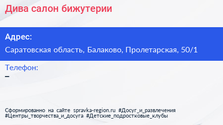 Дива, салон бижутерии по адресу Саратовская область, Балаково, Пролетарская, 50/1 в дальнейшем Организация, размещена в следующих категориях: