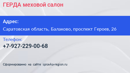 ГЕРДА, меховой салон по адресу Саратовская область, Балаково, проспект Героев, 26 в дальнейшем Организация, размещена в следующих категориях: