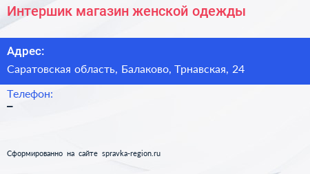 Интершик, магазин женской одежды по адресу Саратовская область, Балаково, Трнавская, 24 в дальнейшем Организация, размещена в следующих категориях:
