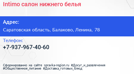 Intimo, салон нижнего белья по адресу Саратовская область, Балаково, Ленина, 78 в дальнейшем Организация, размещена в следующих категориях:
