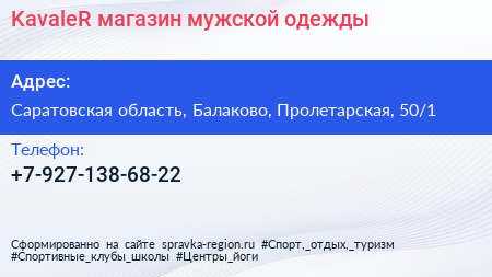 KavaleR, магазин мужской одежды по адресу Саратовская область, Балаково, Пролетарская, 50/1 в дальнейшем Организация, размещена в следующих категориях:
