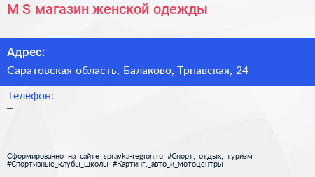 M & S, магазин женской одежды по адресу Саратовская область, Балаково, Трнавская, 24 в дальнейшем Организация, размещена в следующих категориях: