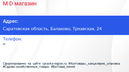 M.D., магазин по адресу Саратовская область, Балаково, Трнавская, 24 в дальнейшем Организация, размещена в следующих категориях: