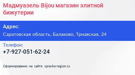Мадмуазель Bijou, магазин элитной бижутерии по адресу Саратовская область, Балаково, Трнавская, 24 в дальнейшем Организация, размещена в следующих категориях:
