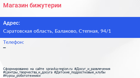 Магазин бижутерии по адресу Саратовская область, Балаково, Степная, 94/1 в дальнейшем Организация, размещена в следующих категориях: