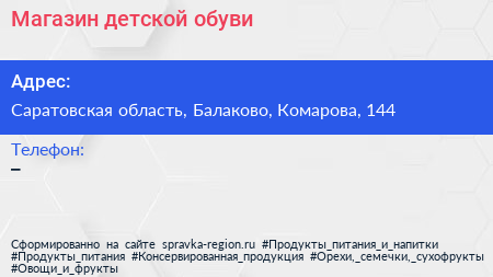 Магазин детской обуви по адресу Саратовская область, Балаково, Комарова, 144 в дальнейшем Организация, размещена в следующих категориях: