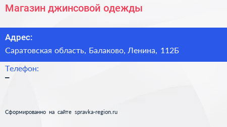 Магазин джинсовой одежды по адресу Саратовская область, Балаково, Ленина, 112Б в дальнейшем Организация, размещена в следующих категориях: