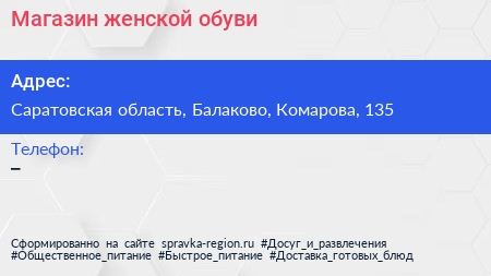 Магазин женской обуви по адресу Саратовская область, Балаково, Комарова, 135 в дальнейшем Организация, размещена в следующих категориях: