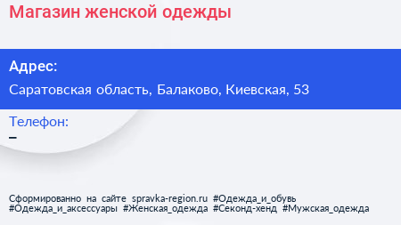Магазин женской одежды по адресу Саратовская область, Балаково, Киевская, 53 в дальнейшем Организация, размещена в следующих категориях: