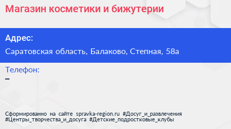 Магазин косметики и бижутерии по адресу Саратовская область, Балаково, Степная, 58а в дальнейшем Организация, размещена в следующих категориях: