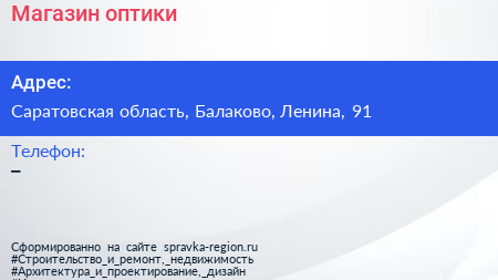 Магазин оптики по адресу Саратовская область, Балаково, Ленина, 91 в дальнейшем Организация, размещена в следующих категориях: