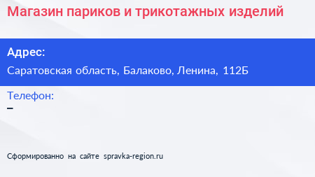 Магазин париков и трикотажных изделий по адресу Саратовская область, Балаково, Ленина, 112Б в дальнейшем Организация, размещена в следующих категориях: