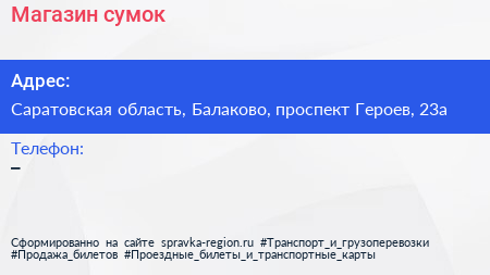 Магазин сумок по адресу Саратовская область, Балаково, проспект Героев, 23а в дальнейшем Организация, размещена в следующих категориях: