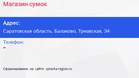Магазин сумок по адресу Саратовская область, Балаково, Трнавская, 34 в дальнейшем Организация, размещена в следующих категориях: