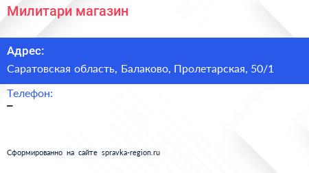 Милитари, магазин по адресу Саратовская область, Балаково, Пролетарская, 50/1 в дальнейшем Организация, размещена в следующих категориях: