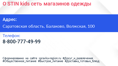 O`STIN kids, сеть магазинов одежды по адресу Саратовская область, Балаково, Волжская, 100 в дальнейшем Организация, размещена в следующих категориях: