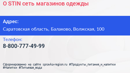 O`STIN, сеть магазинов одежды по адресу Саратовская область, Балаково, Волжская, 100 в дальнейшем Организация, размещена в следующих категориях: