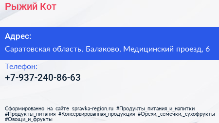 Рыжий Кот по адресу Саратовская область, Балаково, Медицинский проезд, 6 в дальнейшем Организация, размещена в следующих категориях: