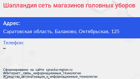 Шапландия, сеть магазинов головных уборов по адресу Саратовская область, Балаково, Октябрьская, 125 в дальнейшем Организация, размещена в следующих категориях: