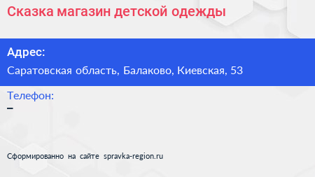 Сказка, магазин детской одежды по адресу Саратовская область, Балаково, Киевская, 53 в дальнейшем Организация, размещена в следующих категориях: