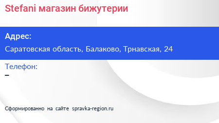 Stefani, магазин бижутерии по адресу Саратовская область, Балаково, Трнавская, 24 в дальнейшем Организация, размещена в следующих категориях: