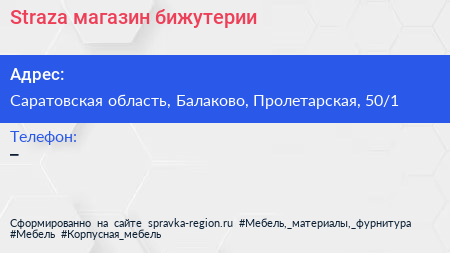 Straza, магазин бижутерии по адресу Саратовская область, Балаково, Пролетарская, 50/1 в дальнейшем Организация, размещена в следующих категориях: