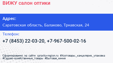 ВИЖУ, салон оптики по адресу Саратовская область, Балаково, Трнавская, 24 в дальнейшем Организация, размещена в следующих категориях: