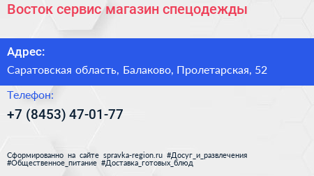 Восток сервис, магазин спецодежды по адресу Саратовская область, Балаково, Пролетарская, 52 в дальнейшем Организация, размещена в следующих категориях: