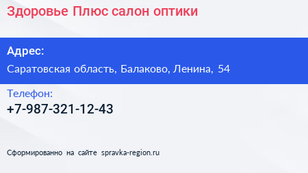 Здоровье-Плюс, салон оптики по адресу Саратовская область, Балаково, Ленина, 54 в дальнейшем Организация, размещена в следующих категориях: