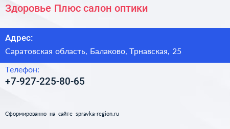Здоровье-Плюс, салон оптики по адресу Саратовская область, Балаково, Трнавская, 25 в дальнейшем Организация, размещена в следующих категориях: