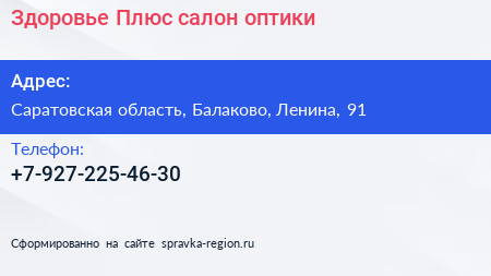 Здоровье-Плюс, салон оптики по адресу Саратовская область, Балаково, Ленина, 91 в дальнейшем Организация, размещена в следующих категориях: