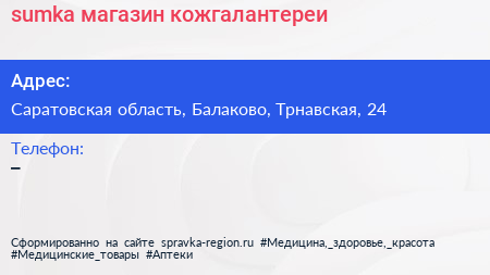 sumka, магазин кожгалантереи по адресу Саратовская область, Балаково, Трнавская, 24 в дальнейшем Организация, размещена в следующих категориях: