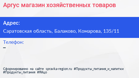 Аргус, магазин хозяйственных товаров по адресу Саратовская область, Балаково, Комарова, 135/11 в дальнейшем Организация, размещена в следующих категориях: