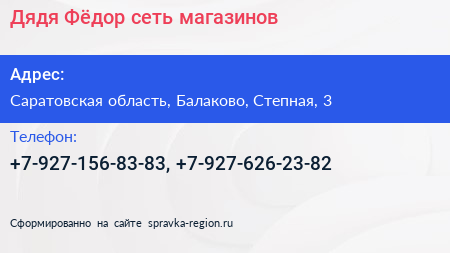 Дядя Фёдор, сеть магазинов по адресу Саратовская область, Балаково, Степная, 3 в дальнейшем Организация, размещена в следующих категориях: