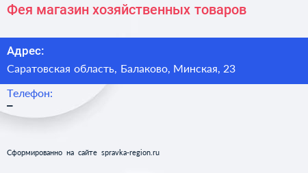 Фея, магазин хозяйственных товаров по адресу Саратовская область, Балаково, Минская, 23 в дальнейшем Организация, размещена в следующих категориях: