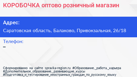КОРОБОЧКА, оптово-розничный магазин по адресу Саратовская область, Балаково, Привокзальная, 26/18 в дальнейшем Организация, размещена в следующих категориях: