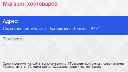 Магазин хозтоваров по адресу Саратовская область, Балаково, Ленина, 94/1 в дальнейшем Организация, размещена в следующих категориях: