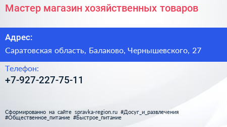 Мастер, магазин хозяйственных товаров по адресу Саратовская область, Балаково, Чернышевского, 27 в дальнейшем Организация, размещена в следующих категориях: