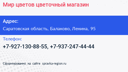 Мир цветов, цветочный магазин по адресу Саратовская область, Балаково, Ленина, 95 в дальнейшем Организация, размещена в следующих категориях: