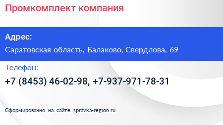 Промкомплект, компания по адресу Саратовская область, Балаково, Свердлова, 69 в дальнейшем Организация, размещена в следующих категориях: