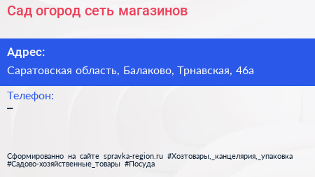 Сад-огород, сеть магазинов по адресу Саратовская область, Балаково, Трнавская, 46а в дальнейшем Организация, размещена в следующих категориях: