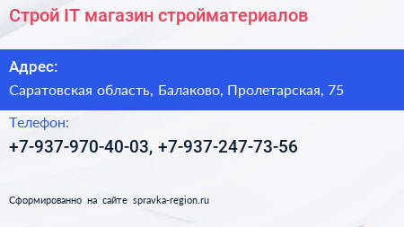 Строй IT, магазин стройматериалов по адресу Саратовская область, Балаково, Пролетарская, 75 в дальнейшем Организация, размещена в следующих категориях: