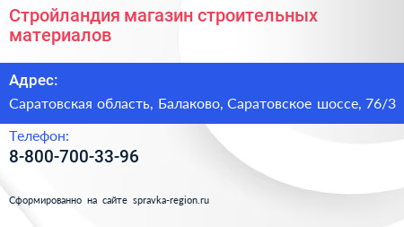 Стройландия, магазин строительных материалов по адресу Саратовская область, Балаково, Саратовское шоссе, 76/3 в дальнейшем Организация, размещена в следующих категориях: