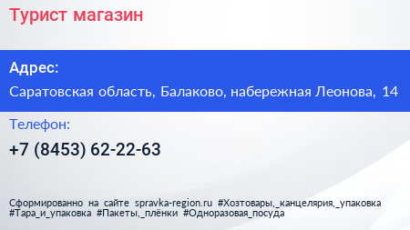 Турист, магазин по адресу Саратовская область, Балаково, набережная Леонова, 14 в дальнейшем Организация, размещена в следующих категориях: