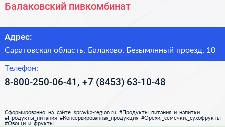 Балаковский, пивкомбинат по адресу Саратовская область, Балаково, Безымянный проезд, 10 в дальнейшем Организация, размещена в следующих категориях: