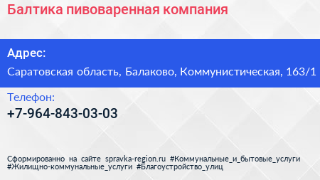 Балтика, пивоваренная компания по адресу Саратовская область, Балаково, Коммунистическая, 163/1 в дальнейшем Организация, размещена в следующих категориях: